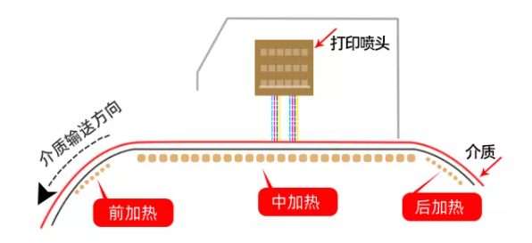 是在材料進入打印區域之前,先對打印介質進行預熱,將其加熱至理想溫度,增強材料對墨水的吸附性,避免飛墨、拉絲、暈染等現象。同時后加熱可以有效地祛除材料中的“濕氣”,減少材料受潮對畫面打印的直接影響,從而提高畫面輸出品質。