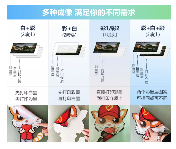 采用分層打印技術(shù),使畫面表面自帶凹凸感,層次分明,支持多種打印模式(彩白彩/白白彩/白彩/彩白/雙彩模式),倍受廣大客戶的親睞。