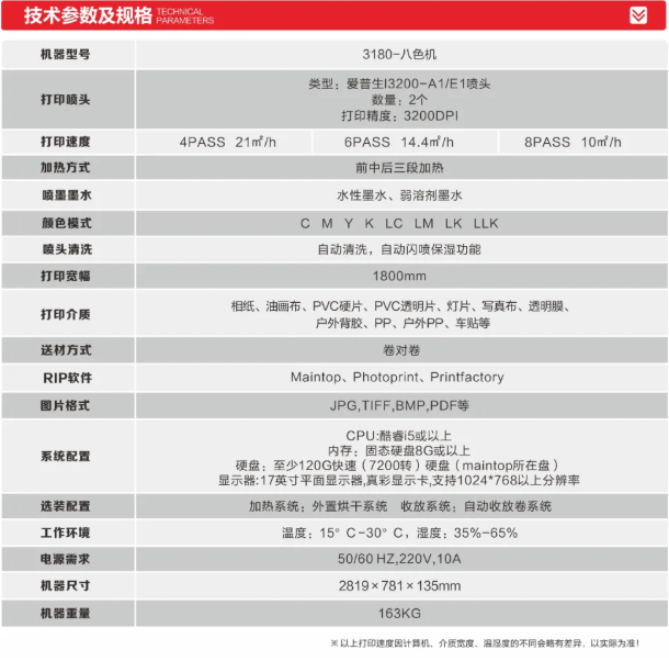 視頻中正在打印的設備正是世紀風旗�2021隆重出品�3180S八色寫真機。該款設備采用愛普生I3200-A1雙噴頭配置,一個噴頭打印深色墨水,一個噴頭打印淺色墨水,打印時�4pass 20�/h�