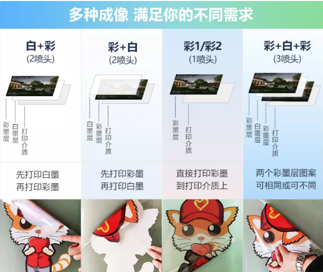 采用分層打印技�(shù),使畫面表面自帶凹凸感,層次分明,支持多種打印模式(彩白�/白白�/白彩/彩白/雙彩模式),倍受廣大客戶的親��