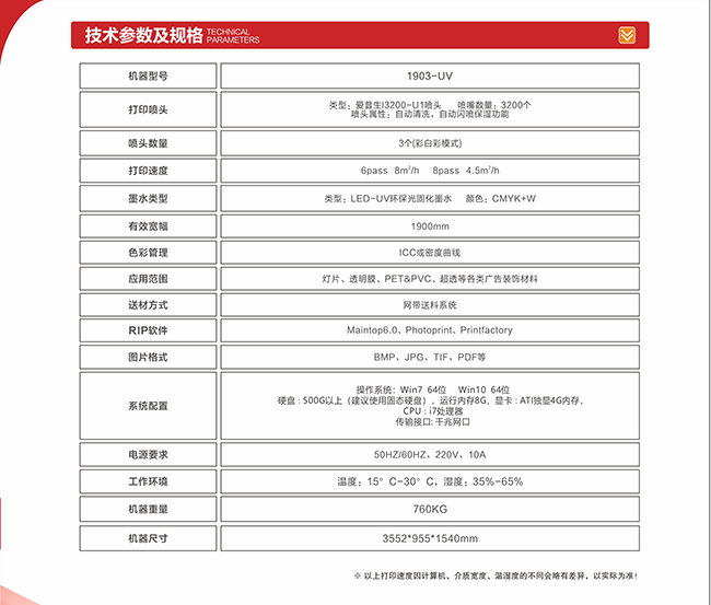 1.9米主流打印寬�,可以滿足日常對多種打印材料的需�;設(shè)備采用THK靜音直線�(dǎo)�,工�(yè)化機(jī)身,�(wěn)定耐用,運行平�(wěn);畫�(zhì)檢測裝置LED光板,打印過程中檢查畫質(zhì)一目了然;UV燈固化速度快,即打即干,提高工作效率�