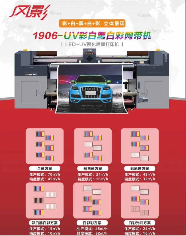 除了全彩模式�1906-UV網帶機還支持彩白�、彩白黑白彩等多種打印模��