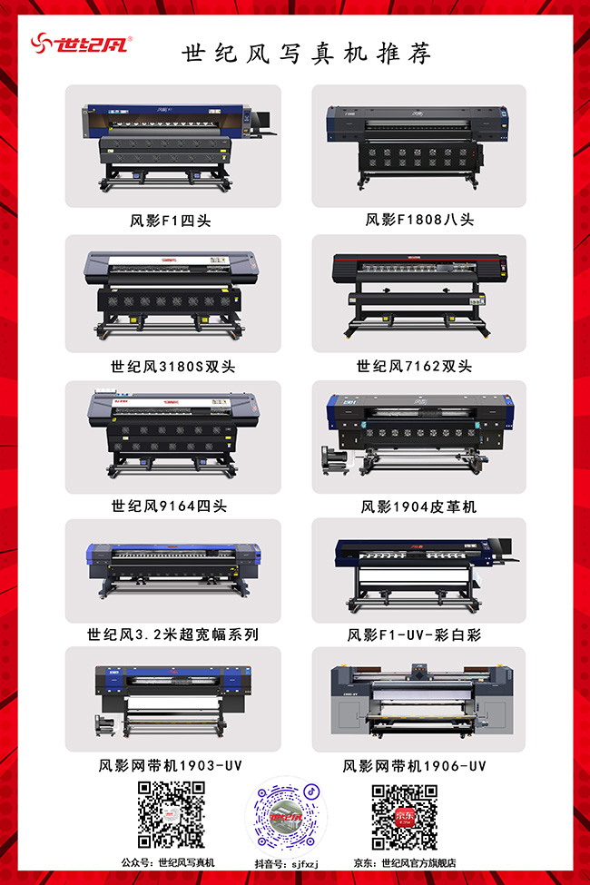 世紀風旗下型號齊全,現有單頭、雙頭、四頭、八頭以�UV網帶機、皮革機等打印設備,幅面�1.6米到3.2米不等,搭載愛普�I3200系列噴頭,輸出畫面飽和度高,過渡平滑,精度可�3200DPI,而且,世紀風寫真機可兼容四色、六色、八色打印,一機多用,選擇性更多�