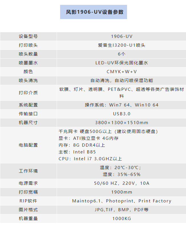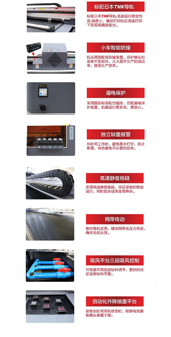1.9米主流打印寬幅,可以滿足日常對多種打印材料的需求;設備采用THK靜音直線導軌,工業化機身,穩定耐用,運行平穩;畫質檢測裝置LED光板,打印過程中檢查畫質一目了然;UV燈固化速度快,即打即干,提高工作效率�