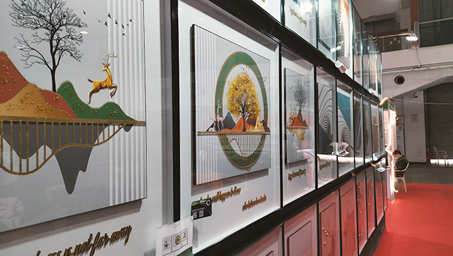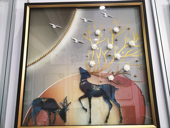在展會現場,很多客戶都是現場看畫,現場成交。晶瓷畫作為一種裝飾品,目之所及的效果是非常重要的。在這次展會上,小編發現,大部分的裝飾畫都不再局限于傳統的打印畫+水晶鉆裝飾風格,而是在其基礎上,加入手工絲線或者手繪的元素,或者是讓裝飾畫兼具實用的作用,比如精美的掛鐘�