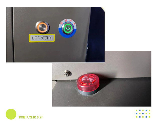 此款設備安裝有LED燈開關,用戶可以根據需要來選擇開啟或是關閉。另外,該款機型還配備有智能缺墨報警系統,在墨水量達到警戒線以下時,會有警報聲響起,提醒工作人員及時加墨�